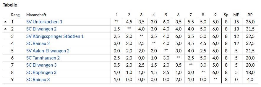Das bedeutete, dass Unterkochen III und Ellwangen II aufstiegen. Der dritte Platz ging hauchdünn an Stödtlen gegenüber unserer Zweiten. Beide hatten 12 Punkte und 32,5 Brettpunkte. Es entschied also der direkte Vergleich. Und da war Stödtlen in dem dramatischen Spiel in der vorletzten Runde ja 3,5-2,5 vorn. Wie ärgerlich...